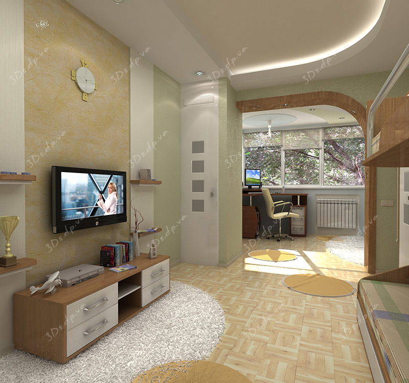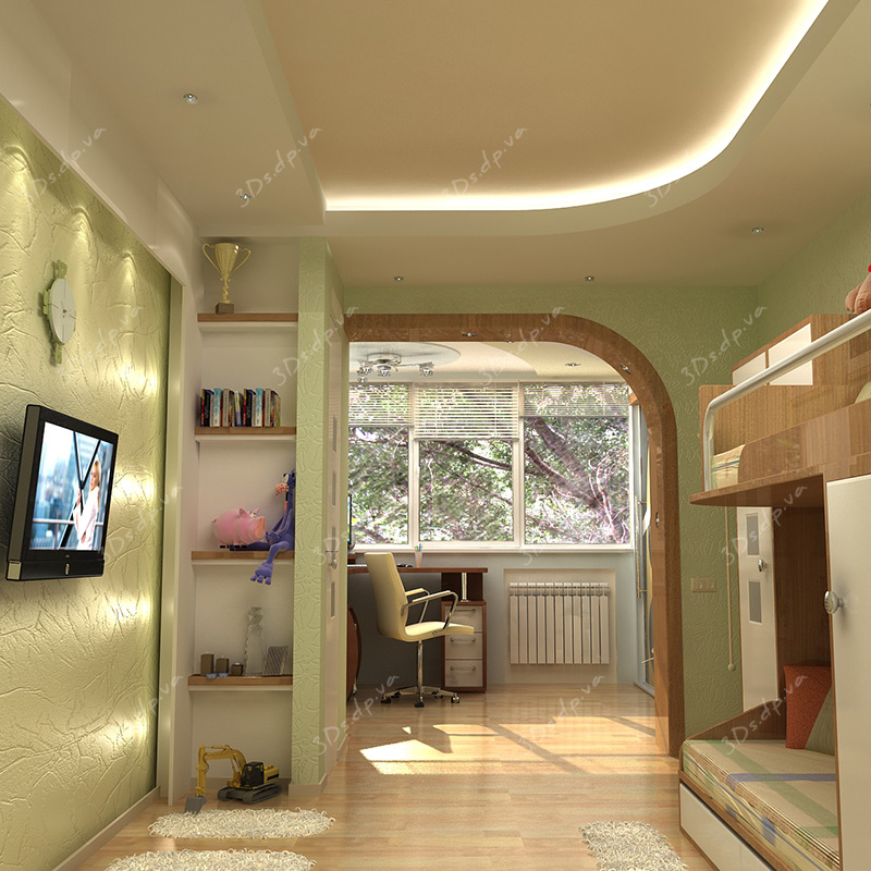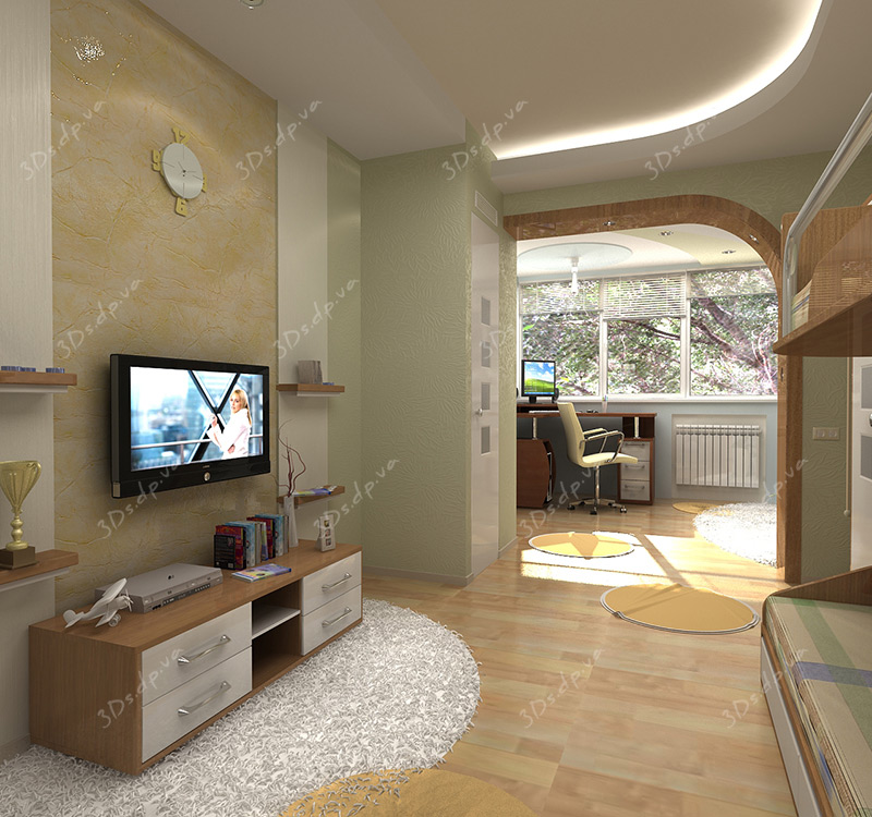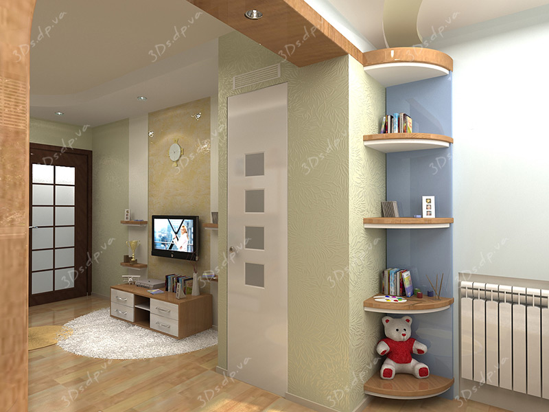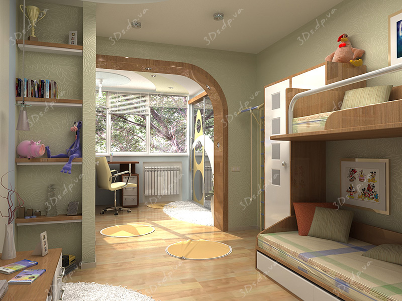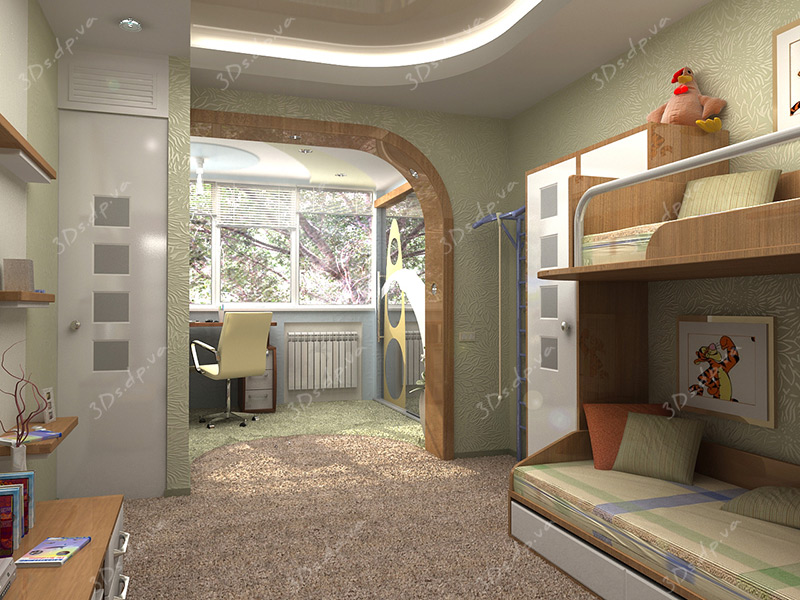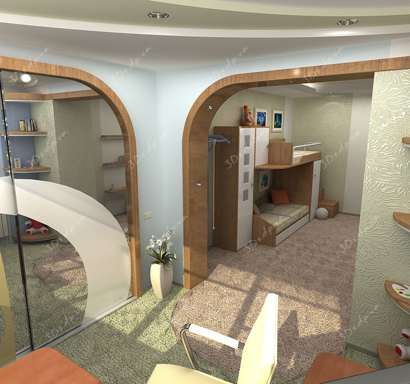 Дизайн детской спальни выполнен в пастельных зелёном, голубом цветах, с добавлением элементов в таких же оранжевых и жёлтых цветах. Мебель представлена в охристом цвете светлого дерева. Цветовое и тональное решение выполнено в мягких светлых оттенках, очень спокойное и неконтрастное, что необходимо для интерьера детской комнаты.