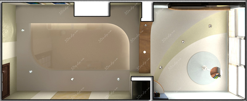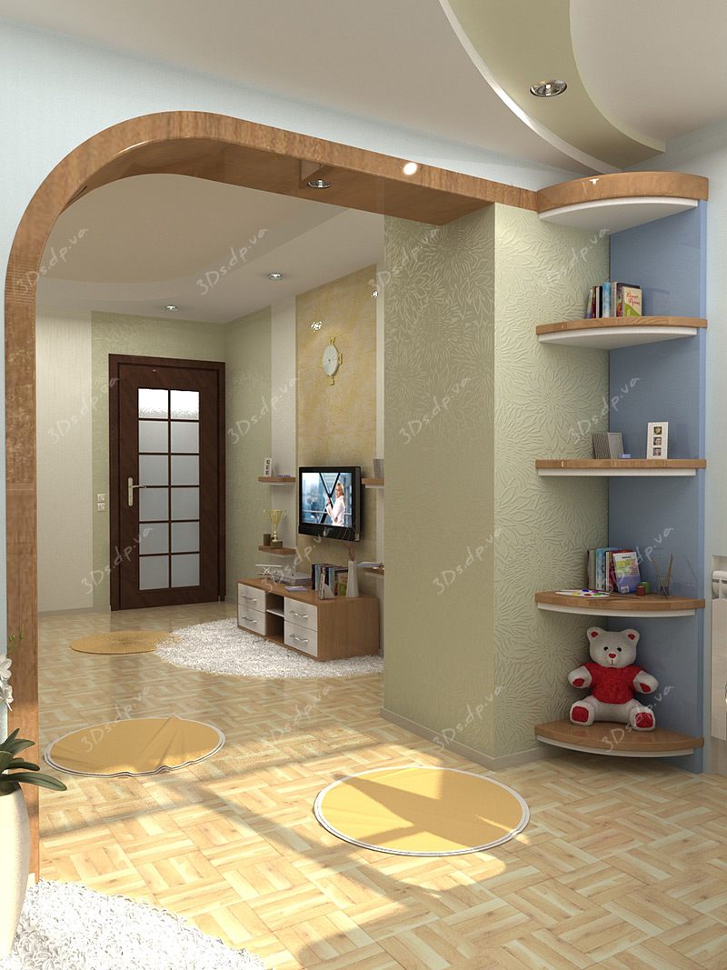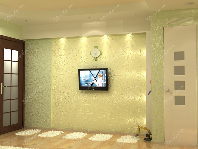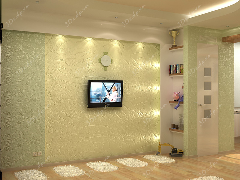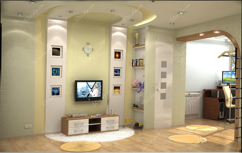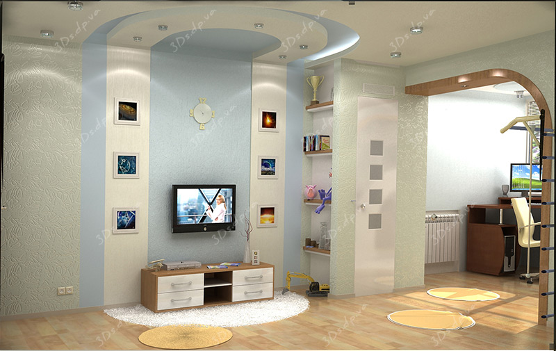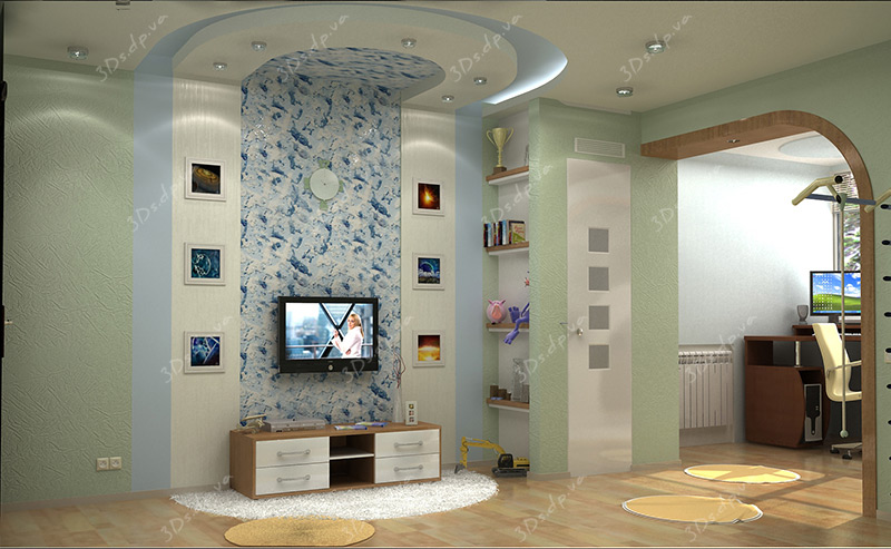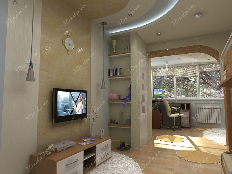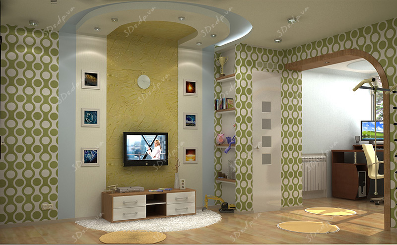 Дизайн детской спальни выполнен в пастельных зелёном, голубом цветах, с добавлением элементов в таких же оранжевых и жёлтых цветах. Мебель представлена в охристом цвете светлого дерева. Цветовое и тональное решение выполнено в мягких светлых оттенках, очень спокойное и неконтрастное, что необходимо для интерьера детской комнаты.