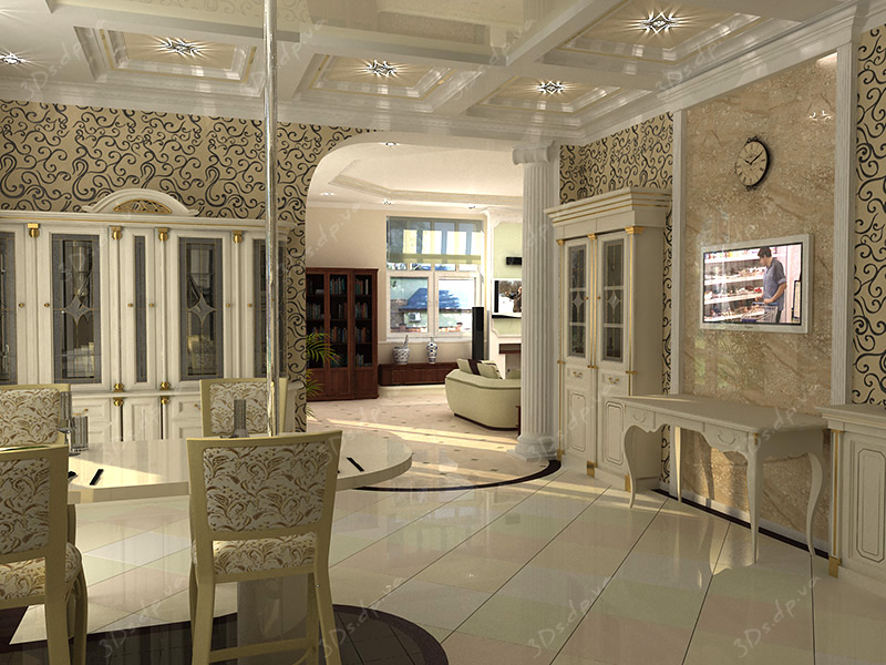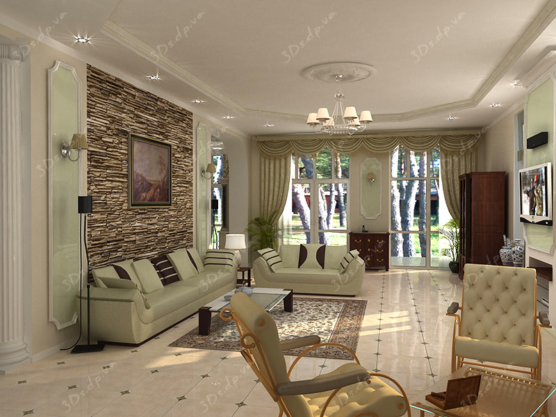 Дизайн гостиной студии загородного дома выполнен по всем традициям классического стиля. Этому стилю присущи гармония и уравновешенность, он как никакой другой способен показать богатство дома. Всё в интерьере выполнено из дорогих качественных материалов.