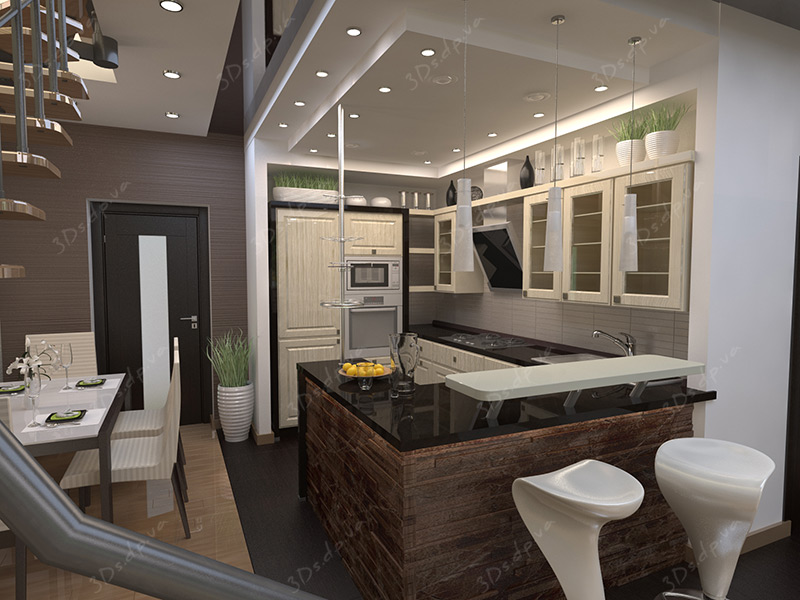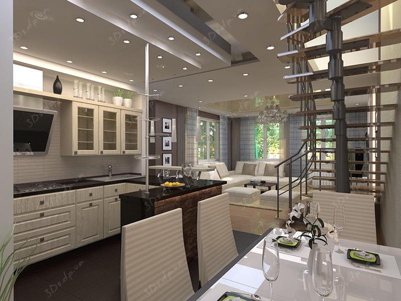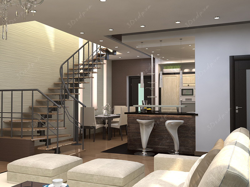 Здесь вы не найдете никакой лишней, мебели, все очень просто: кухонная стенка «г» - образной формы, не большая (что является плюсом - вам не придется наматывать круги) и с удобно расставленным оборудованием (что облегчит процесс приготовления пиши и сократит ваше время), два барных стула, обеденный стол со стульями, большой диван, журнальный столик и небольшая тумба под телевизором. Вот собственно и вся мебель. В комнате есть лестница это всегда выгодный ход в создании интерьера, так как это всегда выглядит красиво.
